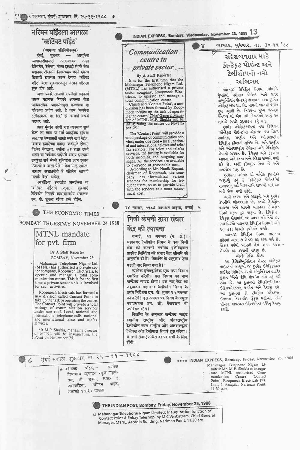 Always looking to new pastures for growth, Roopmeck became the first private player to make an entry into the then fledgling telecom sector by tying up with MTNL and offering various telecom services through their complete communication center known as Contact Point, which offered Fax, STD and ISD facilities.
